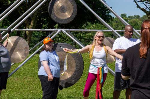 In 2019, with support from the Charles D. and Mary A. Bauer Foundation, Artpark Bridges invited returning partners People Inc. and Empower, to work with teaching artists Cynthia Pegado, Griffin Brady and Connor Caso on various artistic exercises. The groups met at Artpark and in their own facilities learning dance, drumming, and visual art as preparation for public performances at the Artpark amphitheater in Strawberry Moon Festival and on Mainstage with rock legends Foreigner as backing choir. Artpark Bridges participants also collaborated on a sonic sculpture installation, designing and decorating what became a focal point in the Artpark Percussion Garden, another initiative made possible by the support of Charles D. and Mary A. Bauer Foundation. This installation, called the Artpark Bridges Garden, represents an invitation towards universal barrier-free creativity for all.